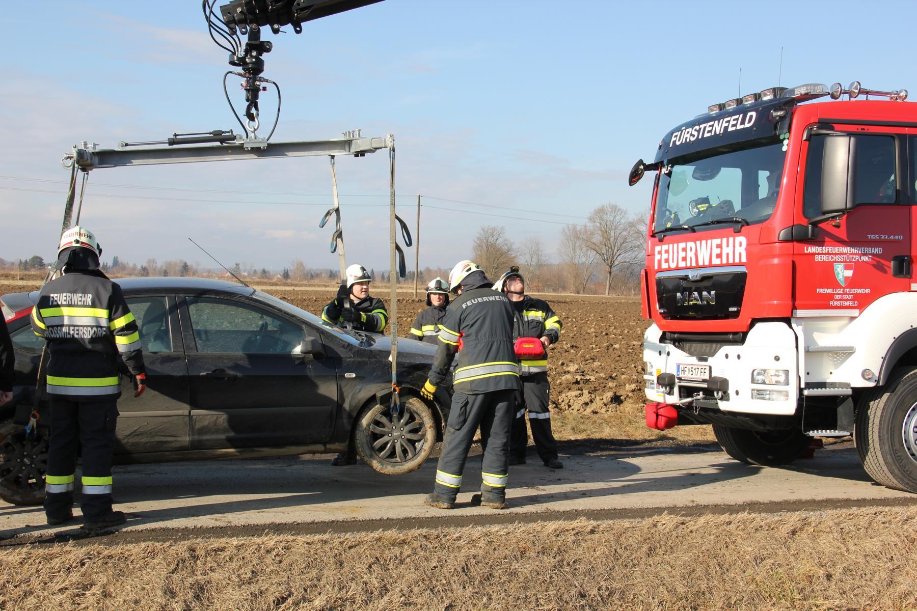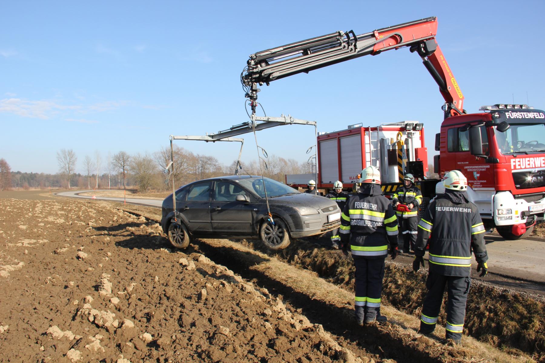 Aufgrund der Lage des Fahrzeuges wurde beschlossen, die Bergung mittels Ladekran des WLF Fürstenfeld durchzuführen.